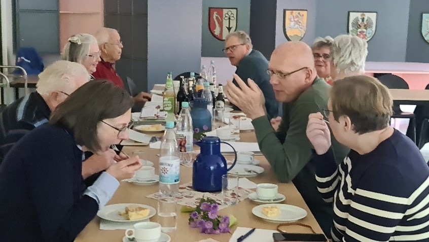 Ansonsten verlief der Tag im eingeübten Rahmen. Da die Teilnehmer zum geringsten Teil aus Düsseldorf sondern von Bremen bis Holland und Hockenheim kamen, war es wichtig, für ihre Beköstigung zu sorgen. Bereits vor dem offiziellen Anfang begannen wir mit Kaffee und Kuchen sowie mit bereitgestellten Getränken. Schnell ergaben sich intensive Gespräche über die Situation der Heimat, der Familienforschung und allgemeinen Themen.